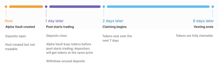 When the token unlocks for claiming, the Alpha Vault then distributes the tokens to depositors. Depositors get tokens at the same price, and the amount of tokens received is based on their share of the total deposits. Creators can configure the Alpha Vault to their preference; whether token claiming is unlocked immediately when the pool starts trading or at a later time/date, and whether there is a vesting period for token claims. This vesting solution has the dual benefit of mitigating against sniper bots as well as encouraging purchase from the strongest and most genuine supporters of the project, since they would be more willing to hold their tokens for a longer period. This helps ensure greater alignment between projects and token holders.