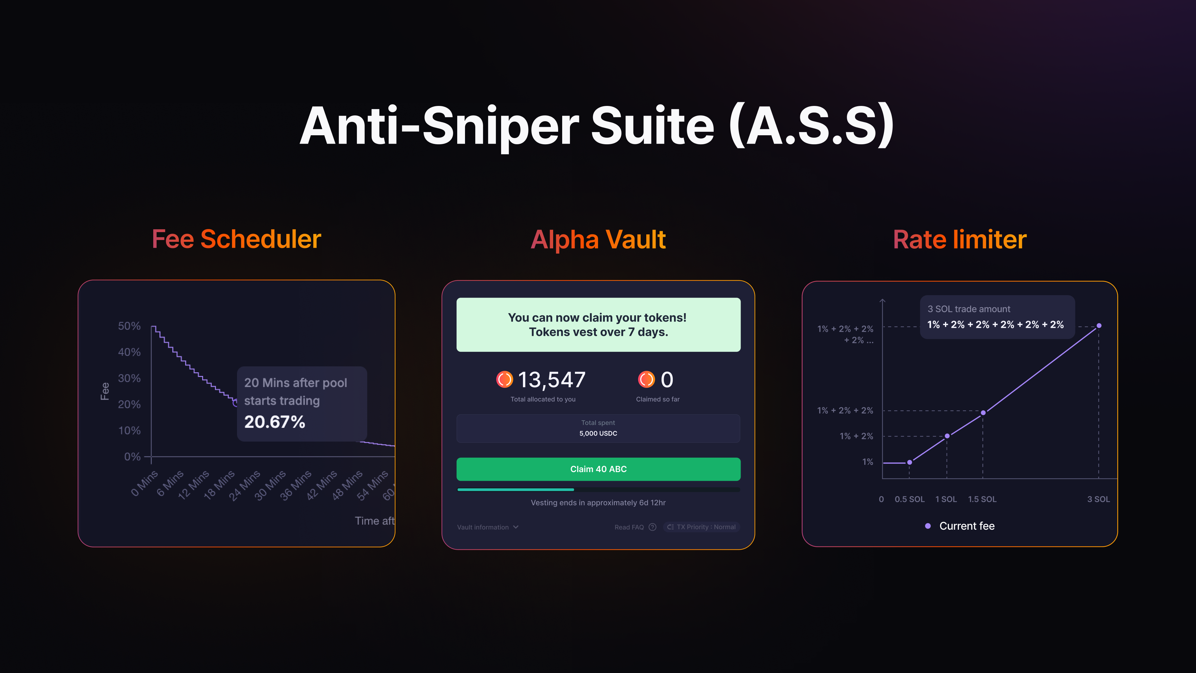 Configurable fee decay over time designed to deter sniper bots by imposing higher fees during the initial launch phase.
