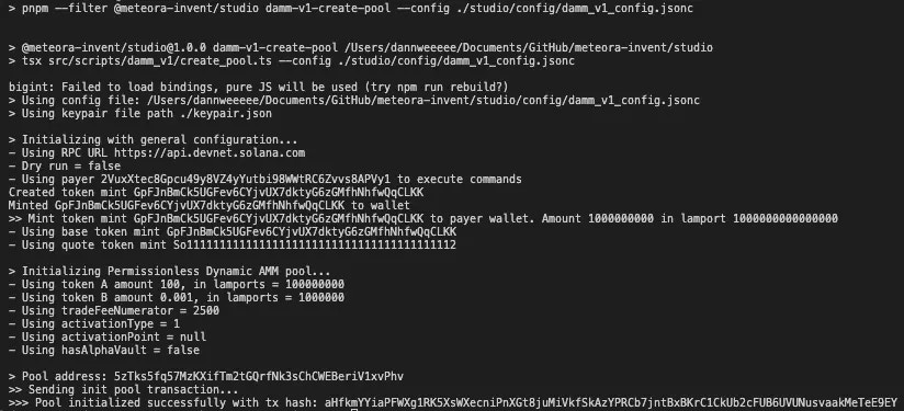 damm_v1_config.jsonc, you can now create your pool by running the following command. These commands will create your pool and If you don’t have a base mint, you can configure
