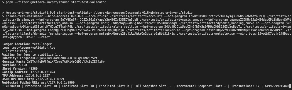 In Meteora Invent we provide an optional command for you to run a local validator to test your pool before deploying it to devnet or mainnet. Run the following command in your code editor terminal to get started.This will start a local validator on your machine which will be hosted on