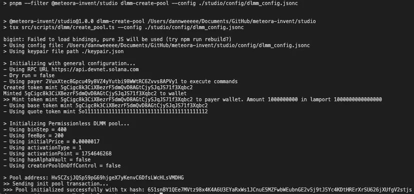 dlmm_config.jsonc, you can now create your pool by running the following command.If you don’t have a base mint, you can configure createBaseToken in the config file and run the