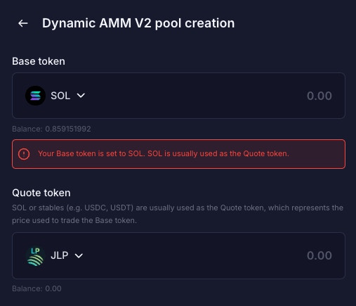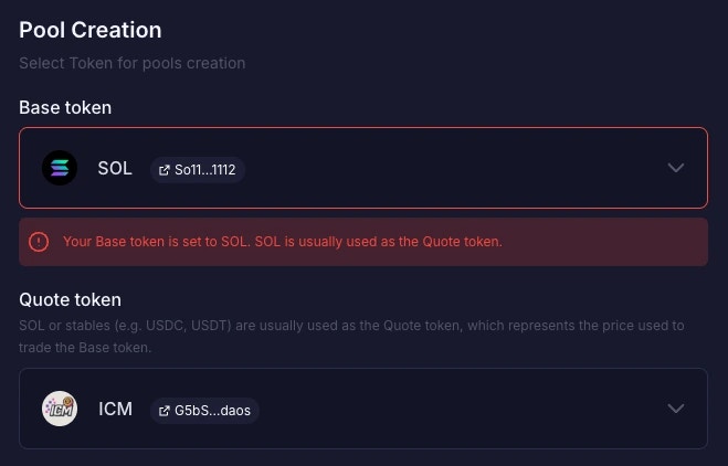 - If you selected SOL, USDC, or USDT as your Base token, there will be a reminder that those tokens are usually used as the Quote token