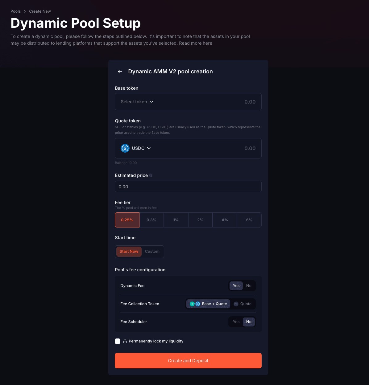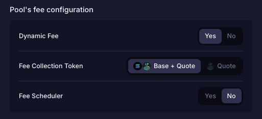 - Fee Collection Token: If you select “Quote”, you will receive your fees earned only in the form of your Quote token (e.g. USDC of SOL).