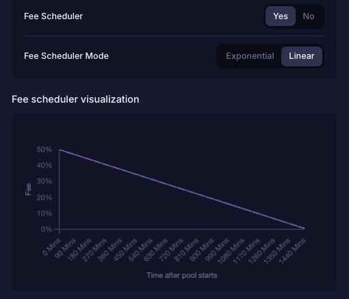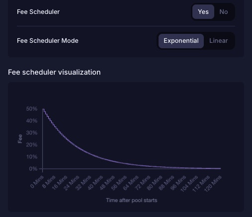 - Fee Scheduler is an anti-sniper mechanism. When enabled, fees charged on trades would start a % higher than the Base Fee, then drop over time until it reaches the Base Fee.