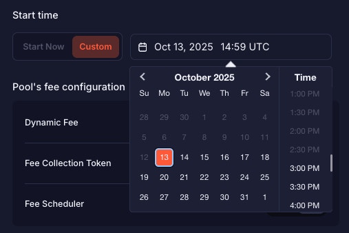 - But you can also choose a “Custom” start time, picking from a future date and time (at 30 min intervals), such that your pool would start trading only from the selected date and time.