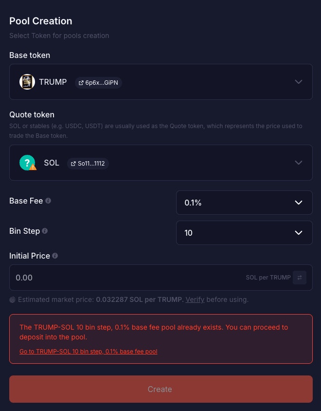 To prevent duplicate DLMM pools, for each token pair, there can only be one pool with a specific Bin Step and Base Fee % parameter combination on Meteora. If that pool already exists, you won’t be able to create a new pool with the same parameters.