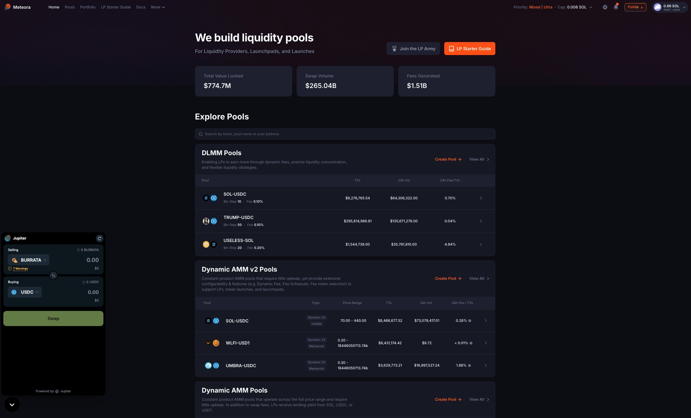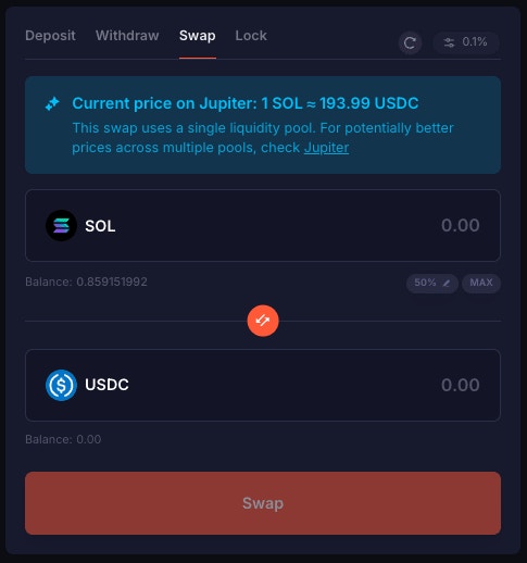 When you already possess one of the tokens in an asset pair for a pool, you can also swap some amounts of that token to the other directly using the existing pool liquidity. DLMM, DAMM v2, and DAMM v1, all have a “Swap” tab to swap tokens directly within the pool. For example, if you want to add liquidity to a SOL/USDC pool, but you only have SOL, you can simply select the “Swap” tab on the pool page to swap a portion your total SOL to an equivalent value of USDC (based on the current pool price of the token). Before you swap through that specific pool, please check that the pool has sufficient liquidity and the current pool price of the token is in sync with the market price. In addition, check that you are comfortable with the settings (e.g. transaction fees, your preferred slippage) of that pool, and check that the “Swap info” section is acceptable before you execute your transaction.