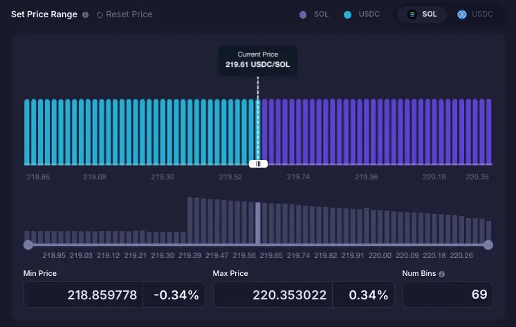 You are able to set the price range for your liquidity position before you execute your deposit. The wider the price range, the higher the number of price bins used for your position. You have 3 methods to adjust your price range to allocate your liquidity in the pool:- You can drag and adjust the two end points of the slider to make your price range narrower. However, adjusting the slider does not allow you to go beyond 69 bins for your price range.