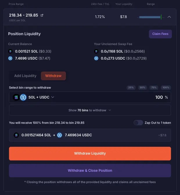LPs earn fees as long as successful swaps happen within their active price range in the pool. This could be swaps within the same active bin or swaps that resulted in closed bin(s) and a new active bin and price. But there can only be one active bin at any point in time. On DLMM, fees do not auto-compound back to the pool. Fees you earn accumulate under “Your Unclaimed Swap Fee” and you’d have to claim them manually.What happens when your position goes “Out of Range”?