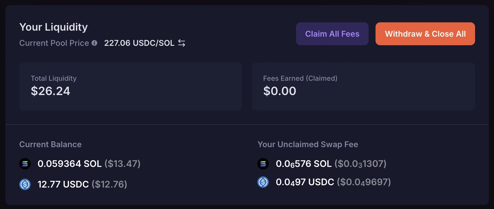 This shows your total liquidity currently deposited in the pool. You are able to click on the number to toggle (switch) between USD or SOL value.Fees Earned (Claimed)