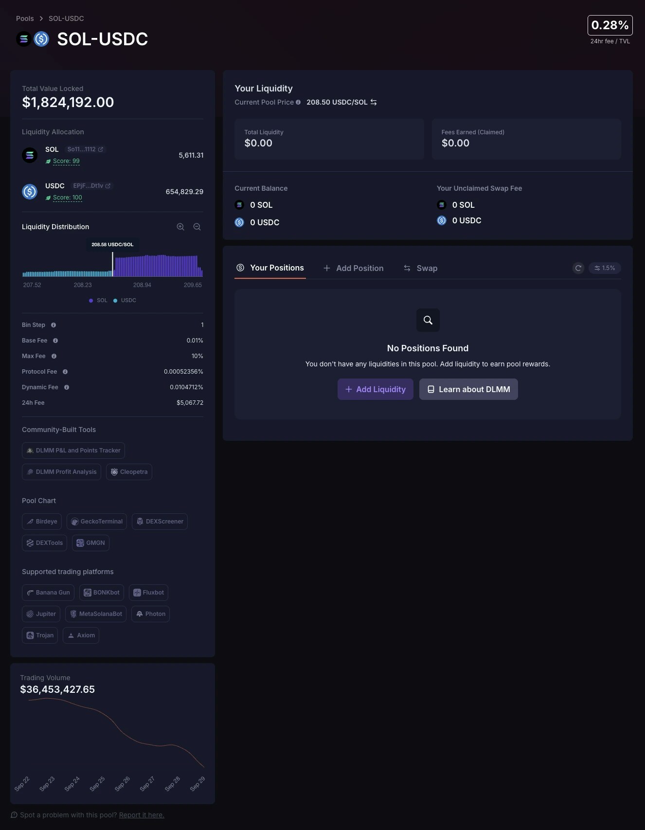 Popular trading platforms and bots have also integrated Meteora’s liquidity pools, including Axiom, Banana Gun, BONKbot, Fluxbot, Jupiter, MetaSolanaBot, Photon, and Trojan. We’ve provided buttons that link specifically to each of the trading platforms. Note: For pools without SOL as the quote token, BONKbot, Photon, and Axiom won’t be in the list.