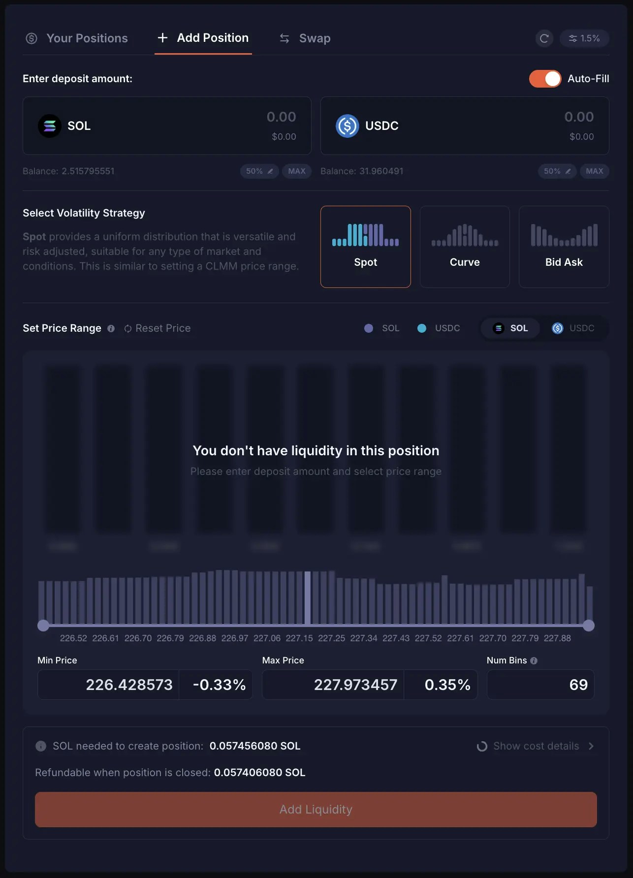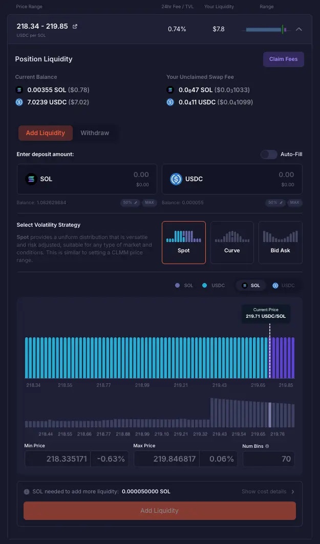 You just bought some SOL at 236.6 USDC per SOL, and you want to gradually swap it for USDC at a profit until it reaches 280 USDC per SOL. You can turn off “Auto-Fill”, enter only the amount of SOL you just bought, and set a price range from 240 to 280 USDC per SOL. You also used the Bid Ask Volatility Strategy. By creating this liquidity position, your SOL gets allocated between 240 to 280 USDC per SOL, and because Bid Ask Volatility Strategy was used, more of your SOL is allocated towards the max price of your range. Whenever SOL price goes into the 240-280 USDC per SOL range, your liquidity position becomes in range and active, and it would start being swapped for USDC. Whenever SOL is swapped for USDC in your position, there will be some cyan blue bins (representing USDC) appearing in the liquidity chart. When the price reaches 280 USDC per SOL, which is the max price of your range, all your SOL would have been swapped for USDC. In the liquidity chart, you will see that all the purple bins (representing SOL) would have turned into cyan blue bins (representing USDC).Cost Details for your Deposit