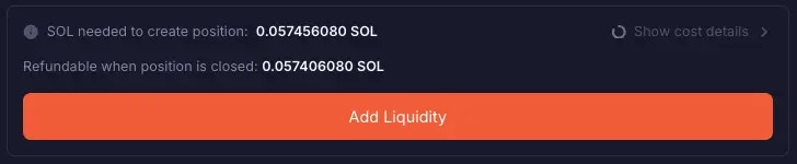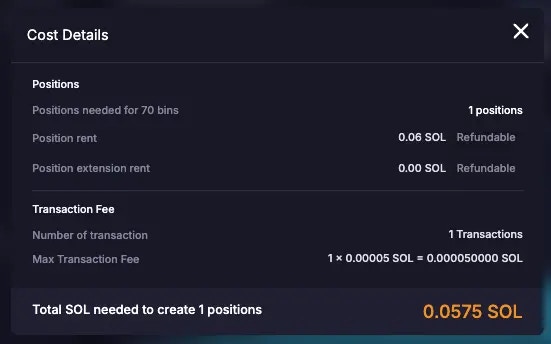 After you’ve entered with the amount of liquidity you plan to deposit, selected your Volatility Strategy, and set the price range where your liquidity gets allocated, you can view the cost involved in opening that position and adding liquidity. When you create a DLMM position, you need to pay some rent. At a glance, Meteora shows you the SOL needed to create your liquidity position, and what portion of the SOL is refundable or non-refundable, when you close your position at a later stage. SOL required for the position creation rent and position extension rent has the “Refundable” label, while the SOL required for creating new bin arrays has the “Non-Refundable” label. In this example, when you close your own position, you are refunded ~0.2374752 SOL, which is the sum of the position rent needed to open your position and the position extension rent.