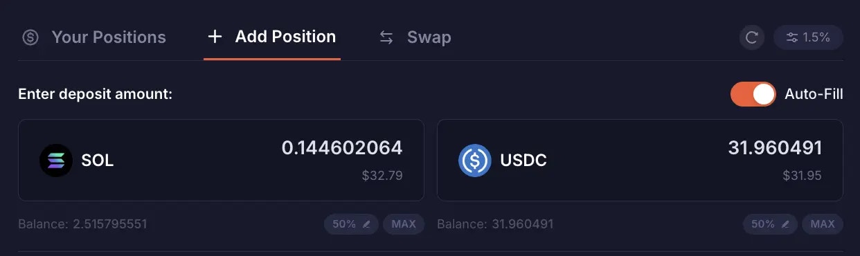 In certain scenarios, LPs may not want to add liquidity with both tokens (dual-sided). Instead, they may want to add liquidity with only one token (single-sided). In order to add liquidity single-sided, you have to first toggle off the “Auto-Fill” feature. This lets you manually enter an amount for either the Base or Quote token without automatically populating the other field.