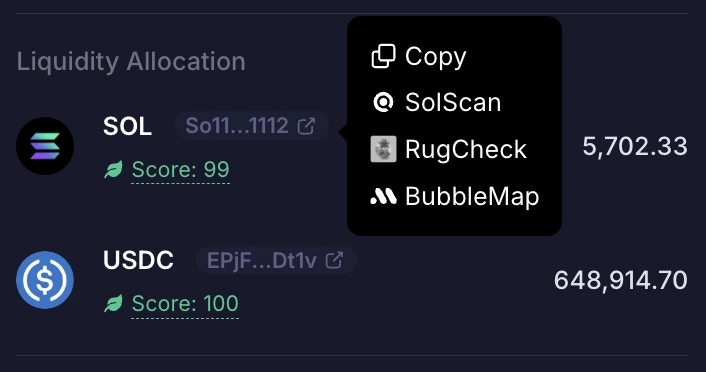 The TVL is further broken down into the amount of each token in the pool. In this screenshot example, $1,632,497 in TVL is actually made up of 5,702.33 SOL and 649,914.70 USDC. In the Liquidity Allocation section, you can view a snippet of the token’s contract address. Click the icon next to it to access important quicklinks; to copy the token’s contract address, view the contract address on solscan, check for token risks on Rugcheck.xyz, or analyze the token behaviour on Bubblemaps.