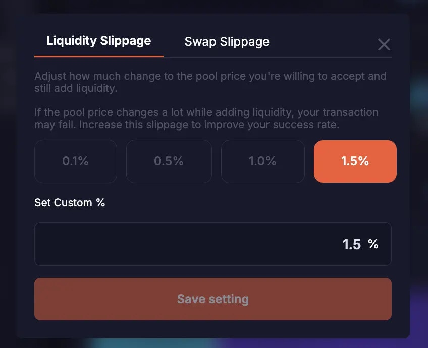 Here you can adjust how much change to the pool price you’re willing to accept and still add liquidity. If the pool price changes a lot while adding liquidity, your transaction may fail. Increase this slippage to improve your success rate.